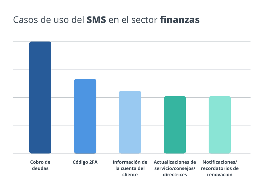 Entre los casos de uso más comunes destacan el cobro de deudas, el envío de códigos 2FA (doble verificación) utilizados para realizar pagos y transferencias seguras o para confirmar la identidad del usuario. También destaca el uso del SMS para el envío de información sobre la cuenta del cliente o para el envío de actualizaciones del servicio y recordatorios.